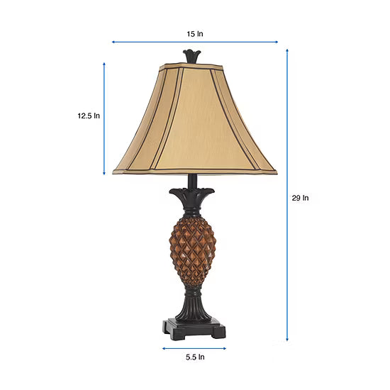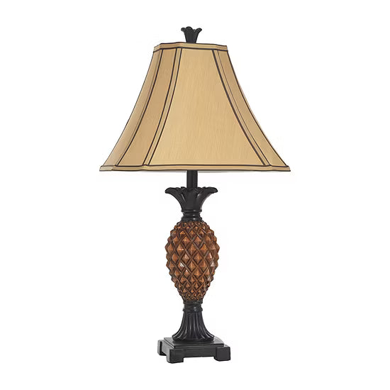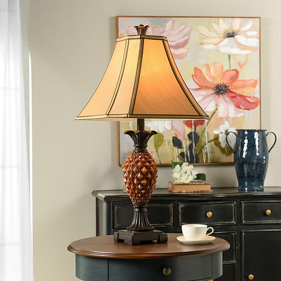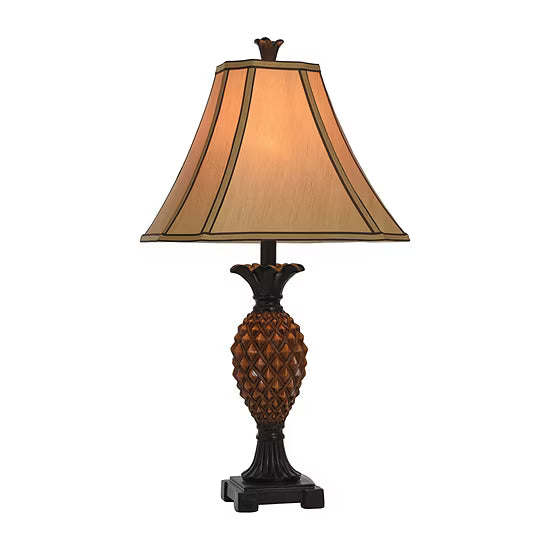This traditional table lamp from Stylecraft features a pineapple textured base and trimmed square cut bell shade. Its distinctive appearance exudes a feeling of welcomeness.