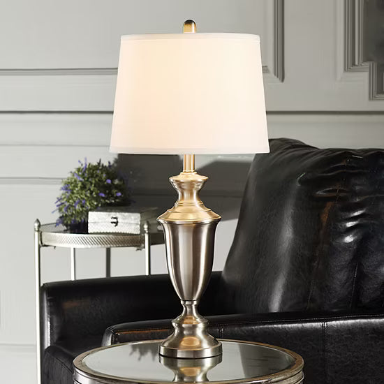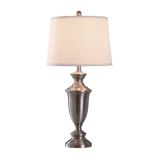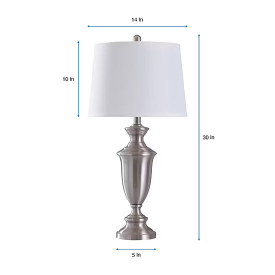 This classic-shaped lamp from Stylecraft features a brushed nickel finish and white tapered drum shade. Its transitional appearance allows one to incorporate in to any décor from traditional to contemporary.