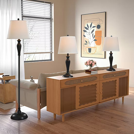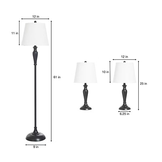 This 3-pc traditional lamp set from Stylecraft includes one floor lamp and two table lamps. These eye-catching lamps feature an oiled bronze finish body and white tapered drum shades, making them a perfect addition to any room.